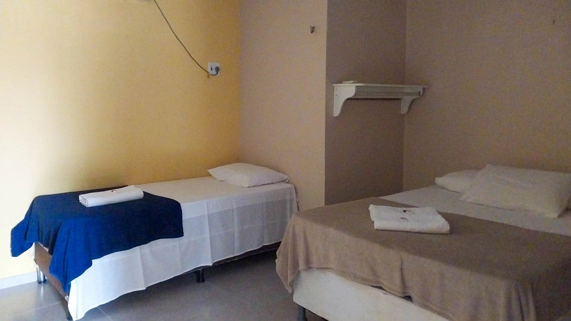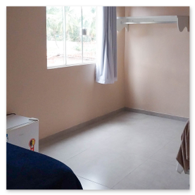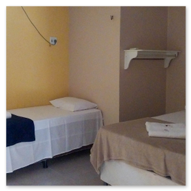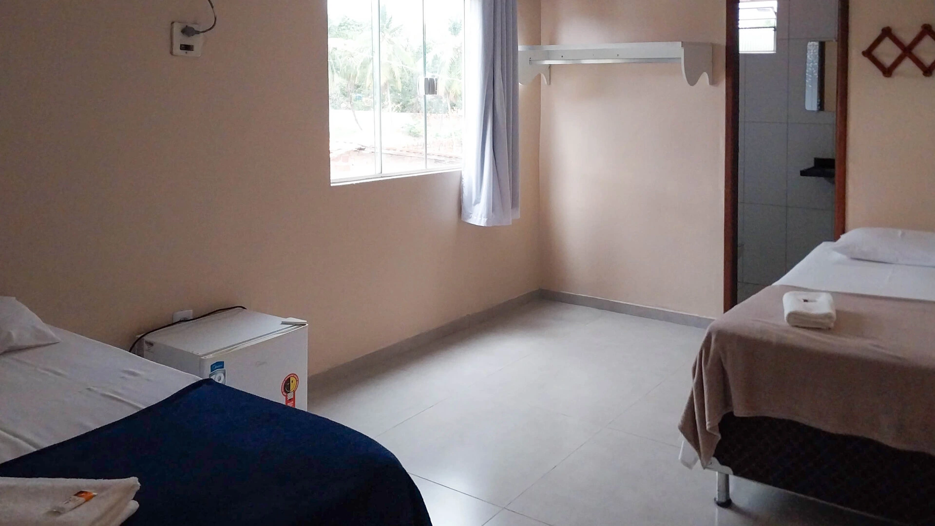 Comodidades: 1 cama de casal, 1 cama de solteiro, TV, ar-condicionado, frigobar, banheiro privativo.