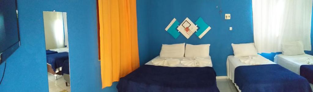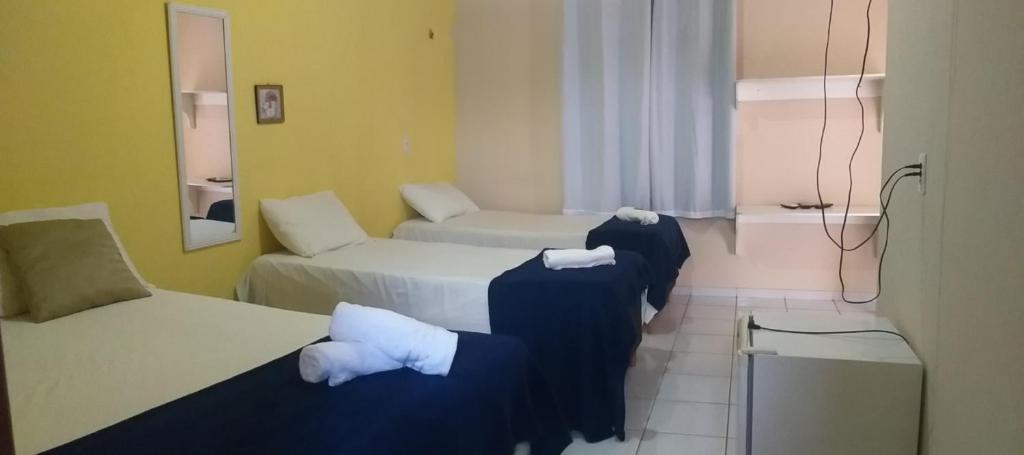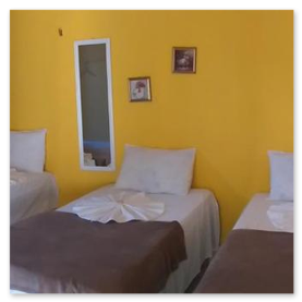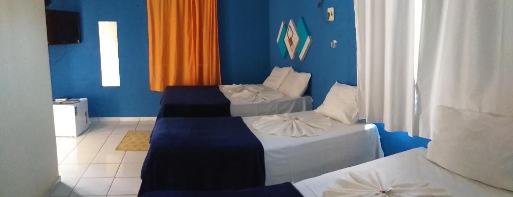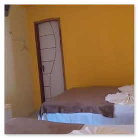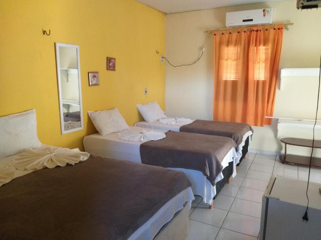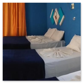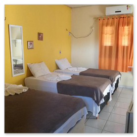 Comodidades: 1 cama de casal, 2 camas de solteiro, TV, ar-condicionado, frigobar, banheiro privativo.